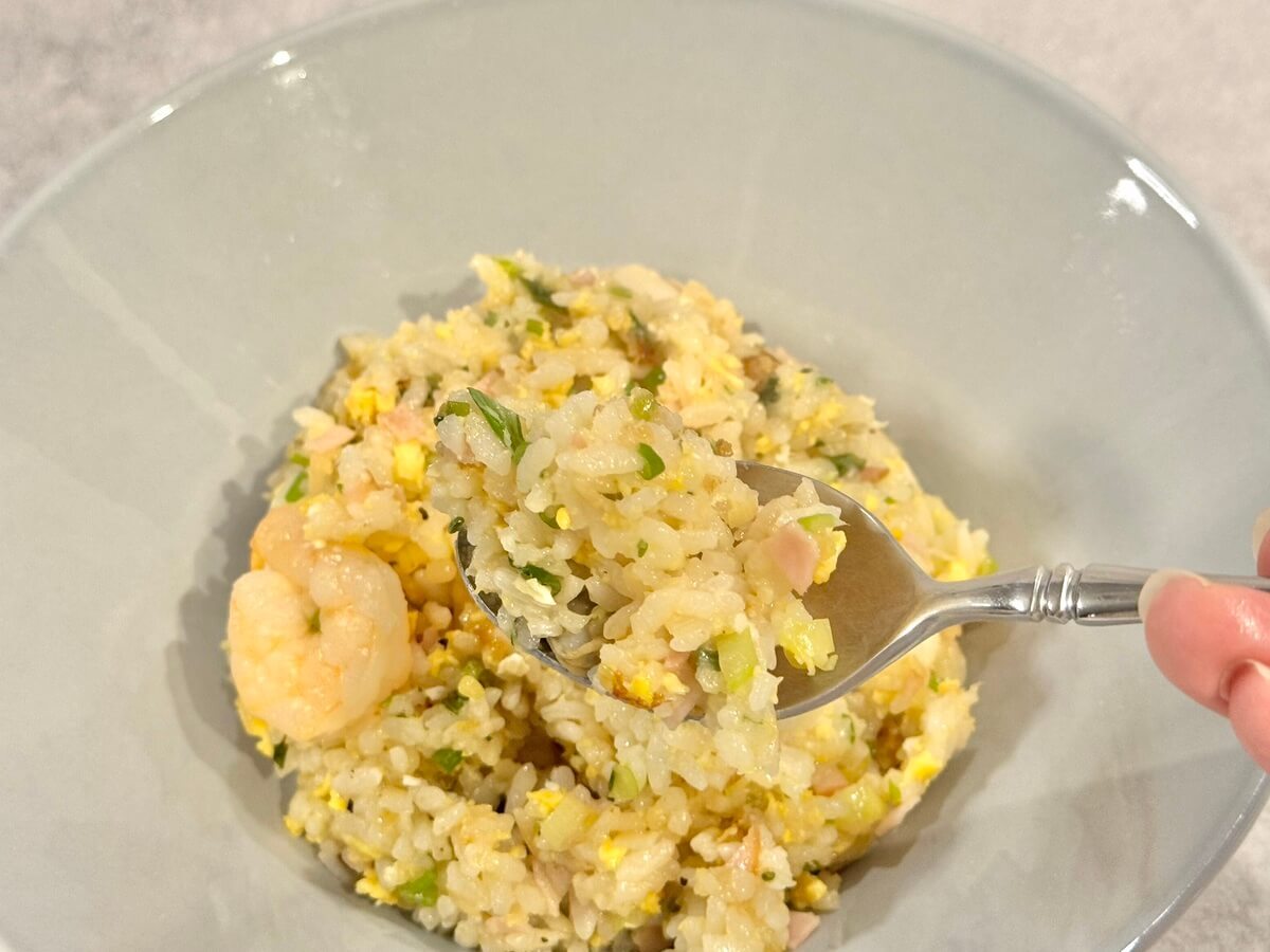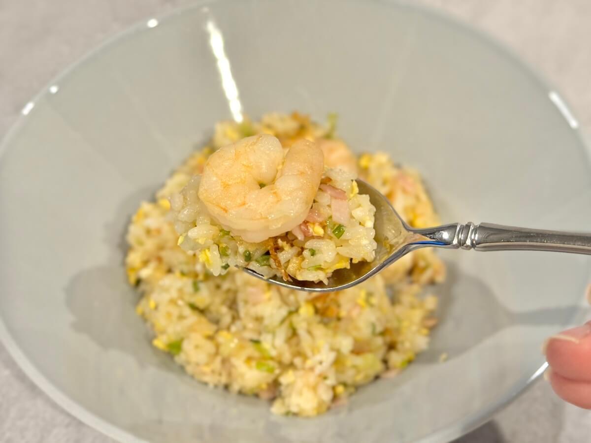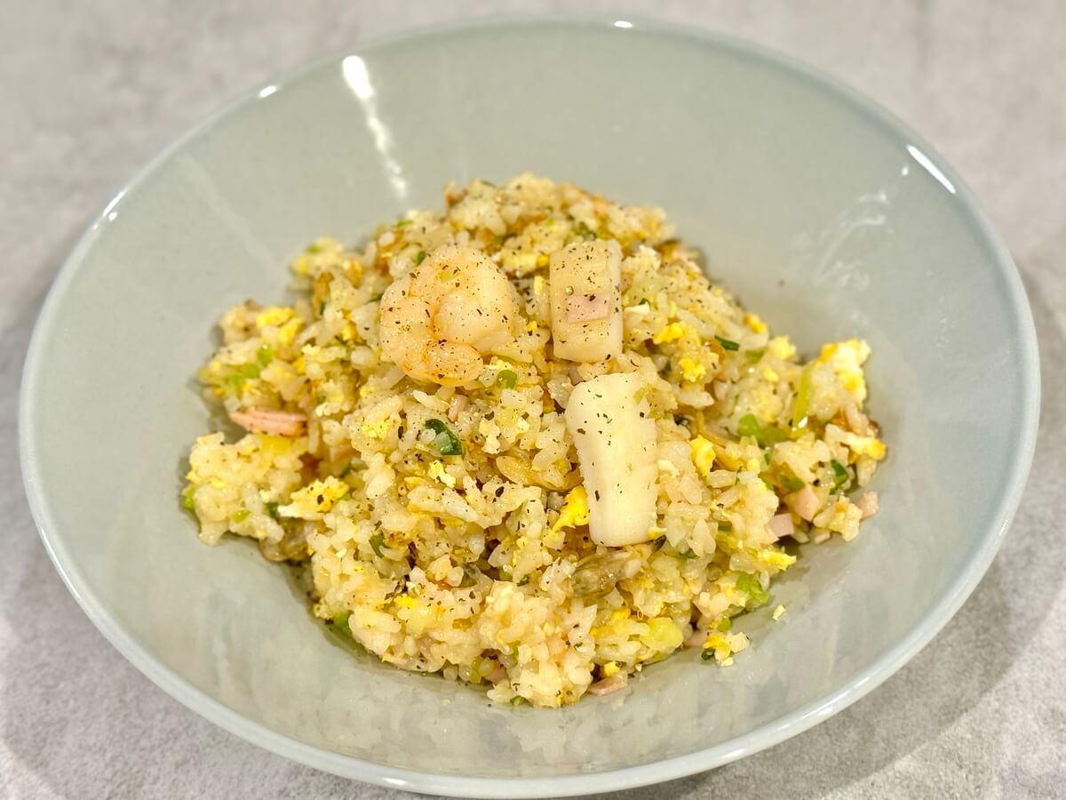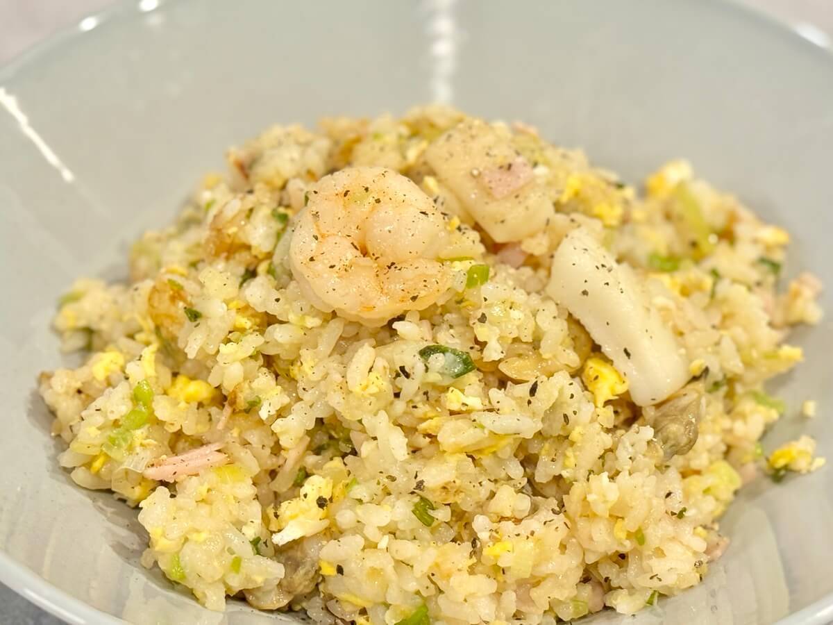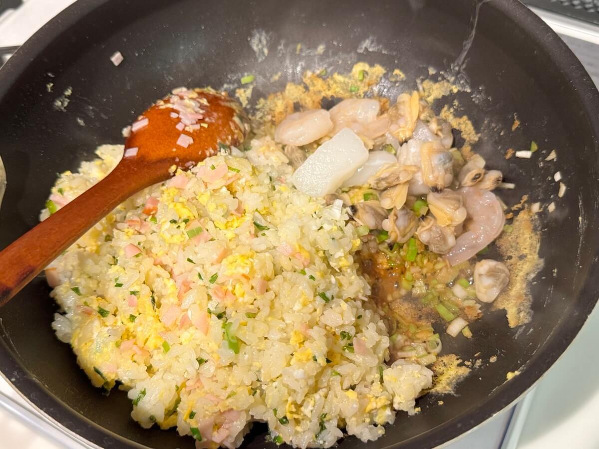塩水で解凍したシーフードもぷりぷりで旨みが逃げていません。ハムなどの具材と一緒に炒めがちですが、シーフードだけ後から入れてさっと炒めたのも大きなポイントですね!