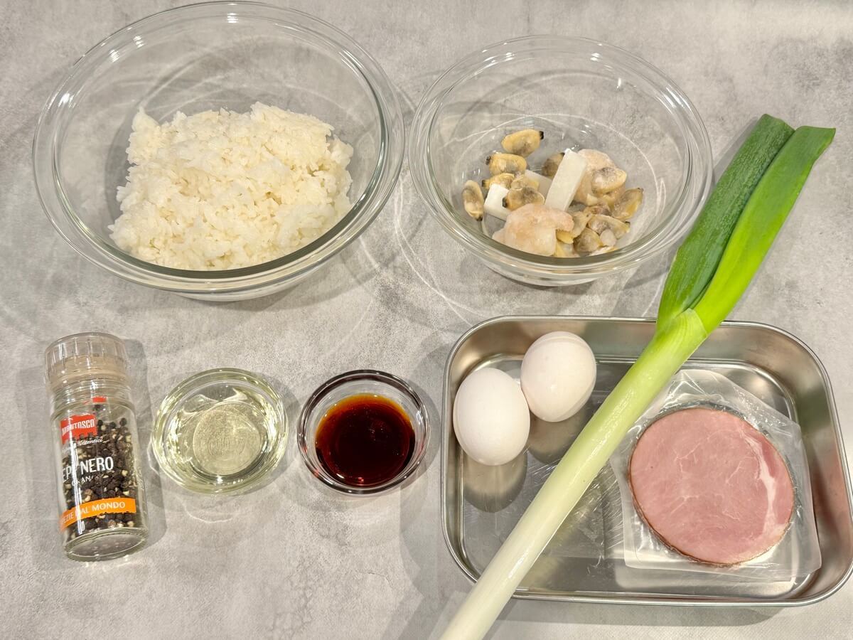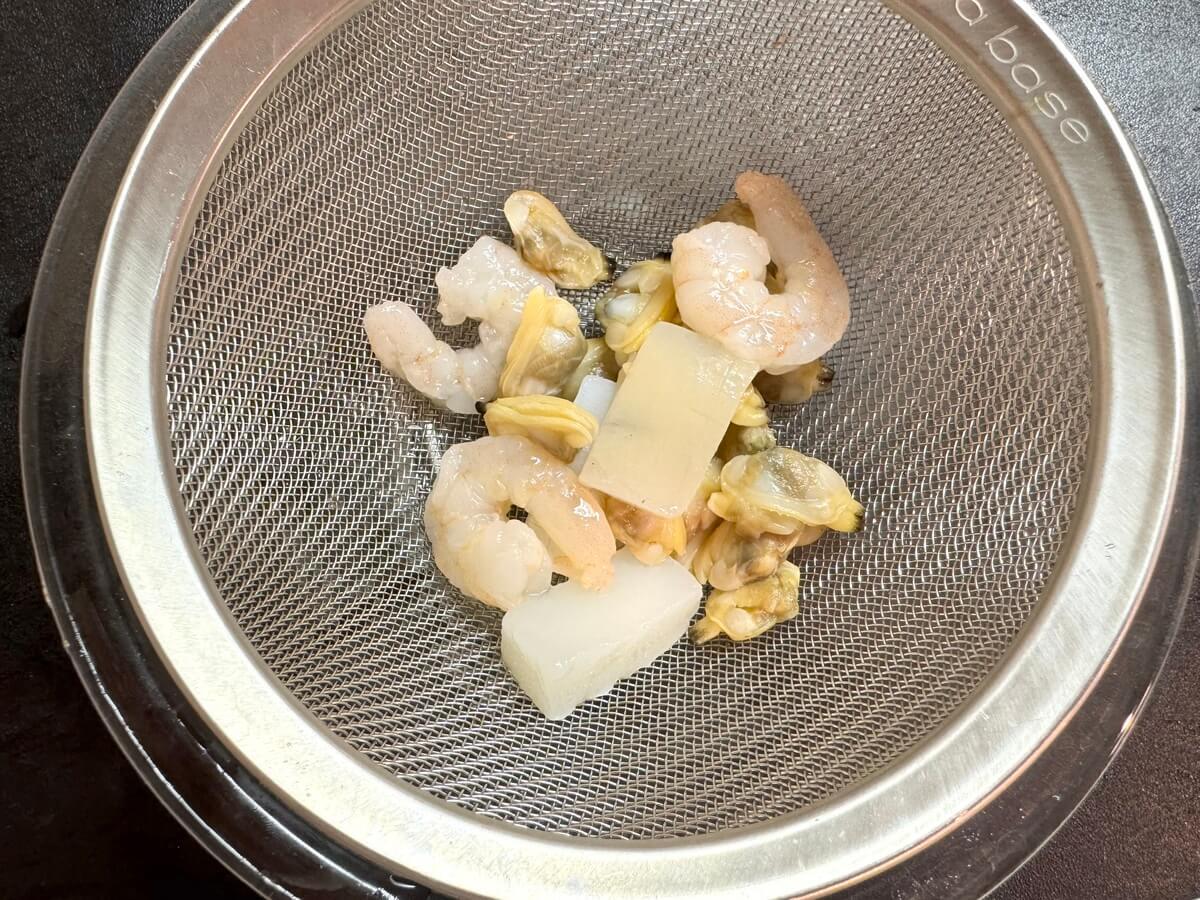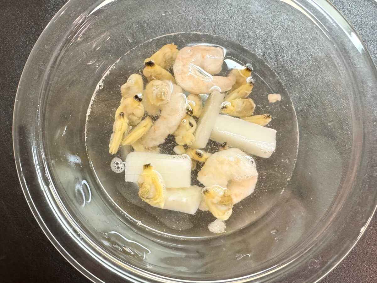 ※冷凍シーフードミックス解凍用の水と塩は写真に載せていません。