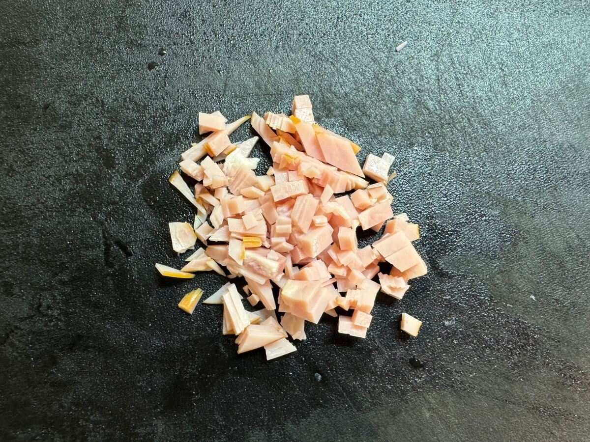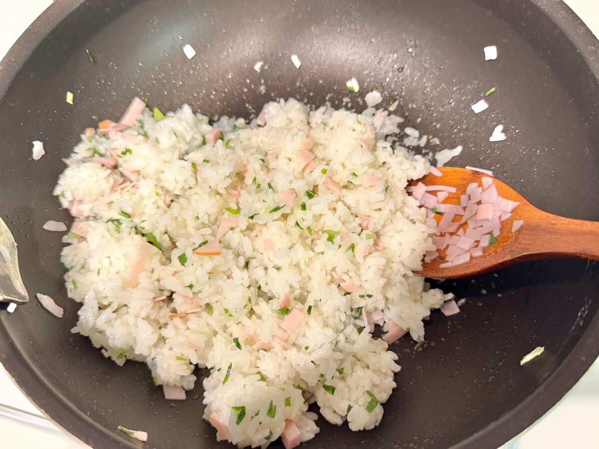 ごはんとハムを加えてさらに炒めましょう。火加減は変わらず中火です。