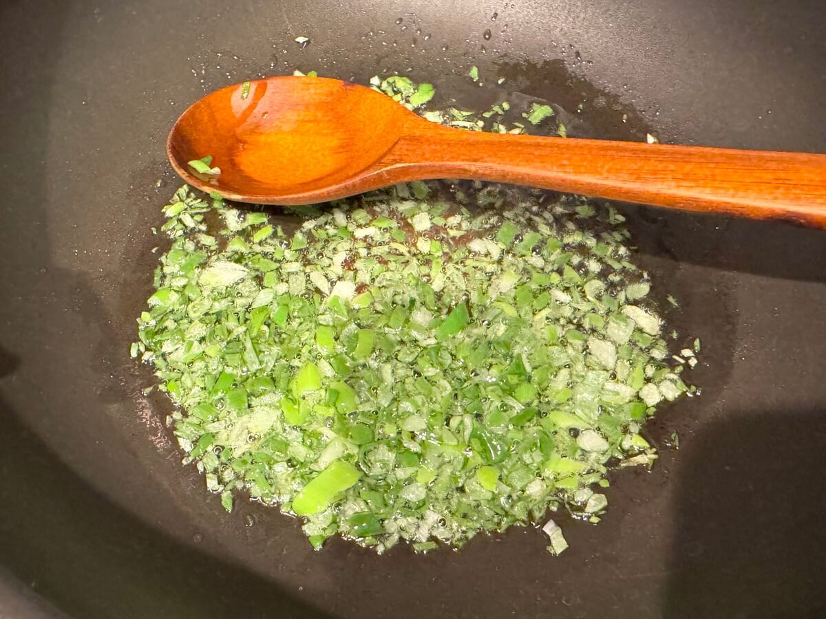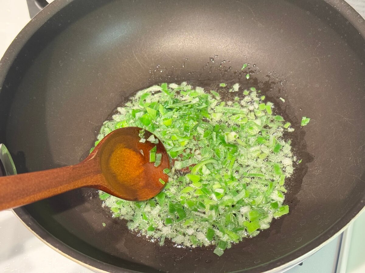 長ネギが加熱されて、カサカサ、としてくるまで炒めましょう。