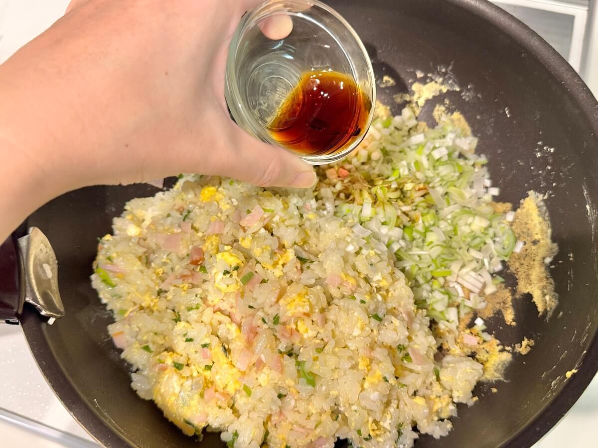 再度ごはんをフライパンの端によせ、空いたスペースに長ネギの白い部分としょうゆを入れます。