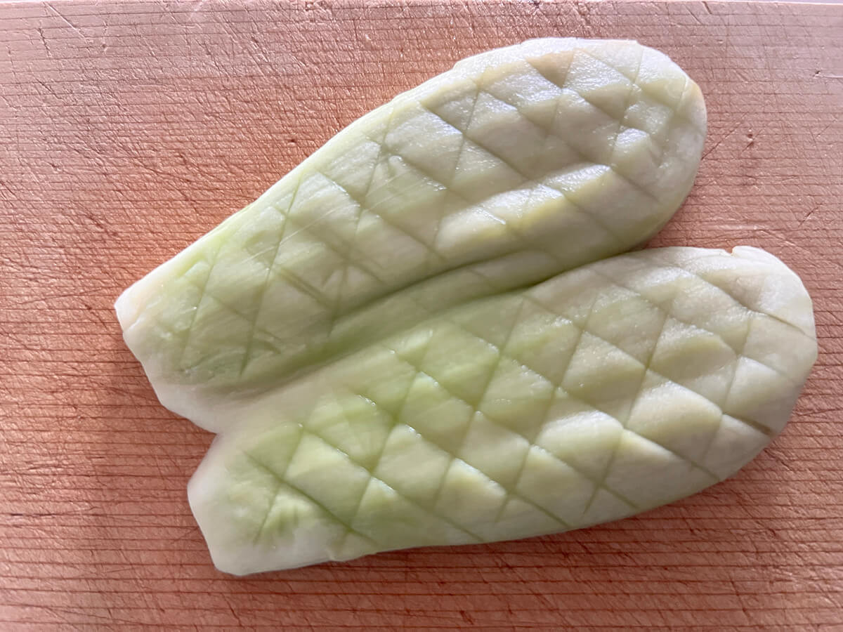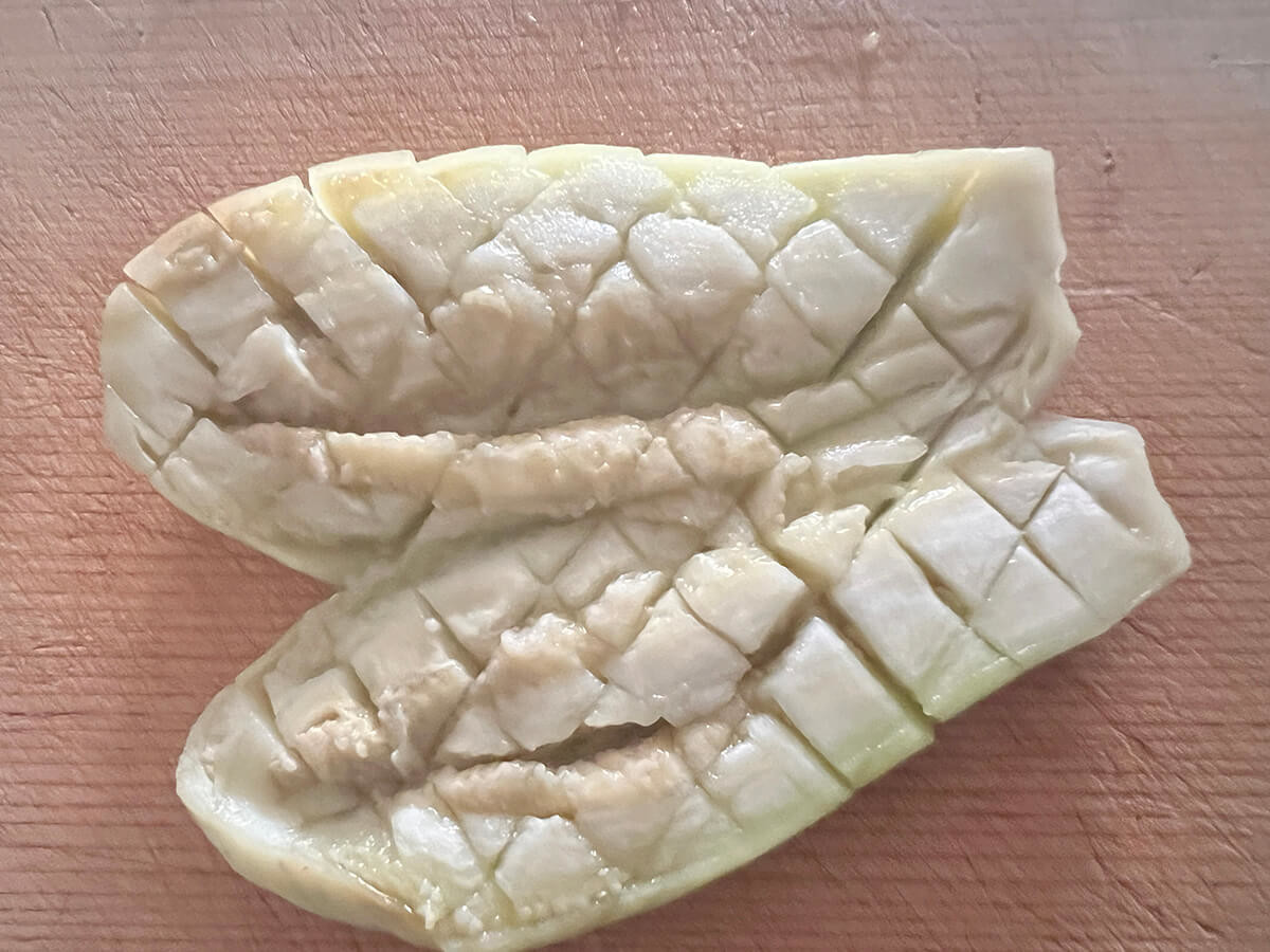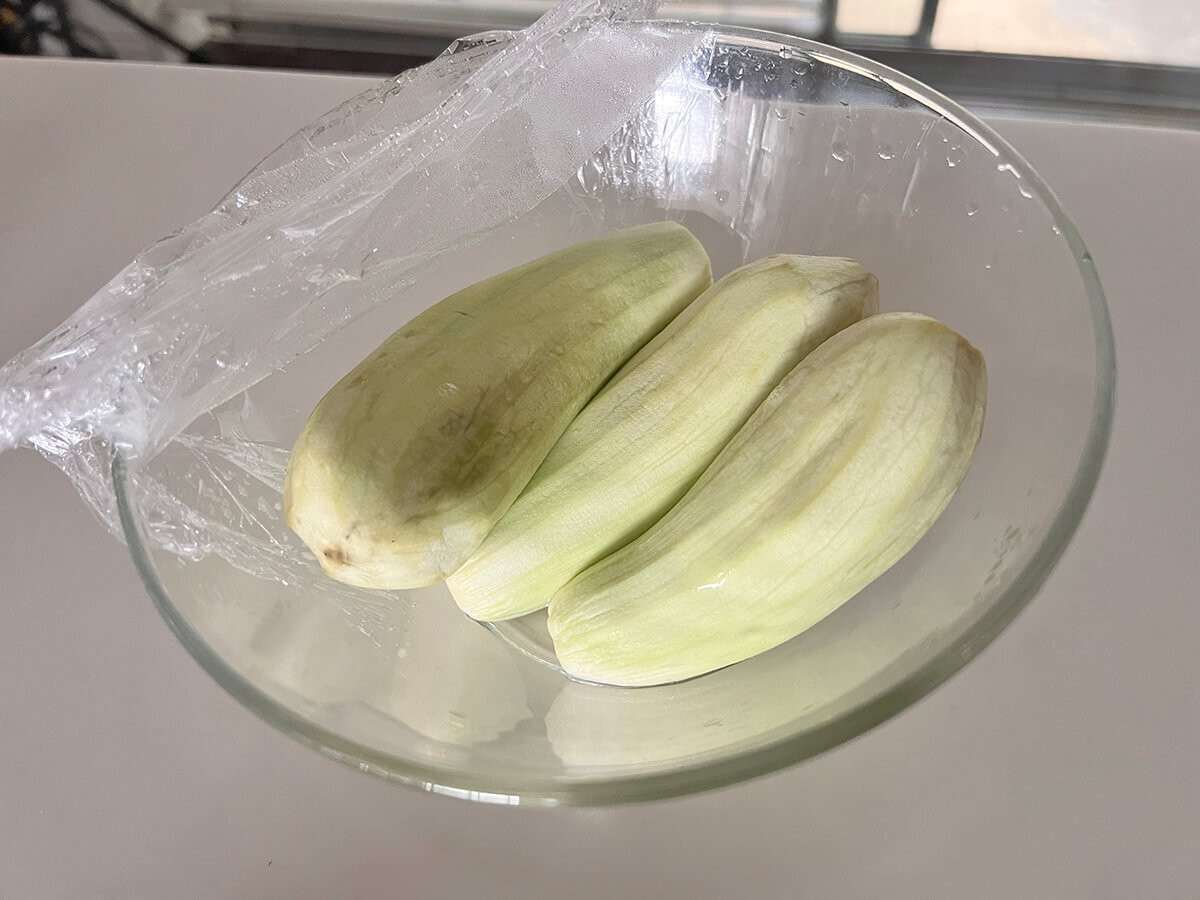なすの粗熱が取れたらラップを外し、なすの中央に縦に切り目を入れ、左右に厚みが半分になるように切り開いて観音開きにします。なすが大きい場合は縦半分に切りましょう。