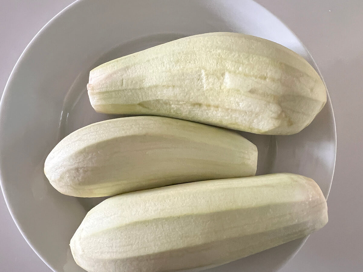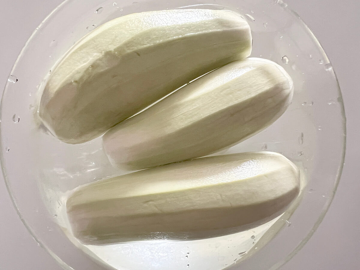 なすはヘタを切り落としてピーラーで皮をむきます。ピーラーを使うとするする上手にむけるので、大好きな作業です。