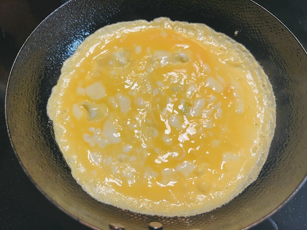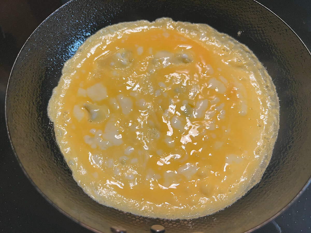 ボウルに卵を溶きほぐし、油を薄くひいたフライパンに1/2量を流して広げ、弱火で八分通り焼き、返してさっと火を通します。