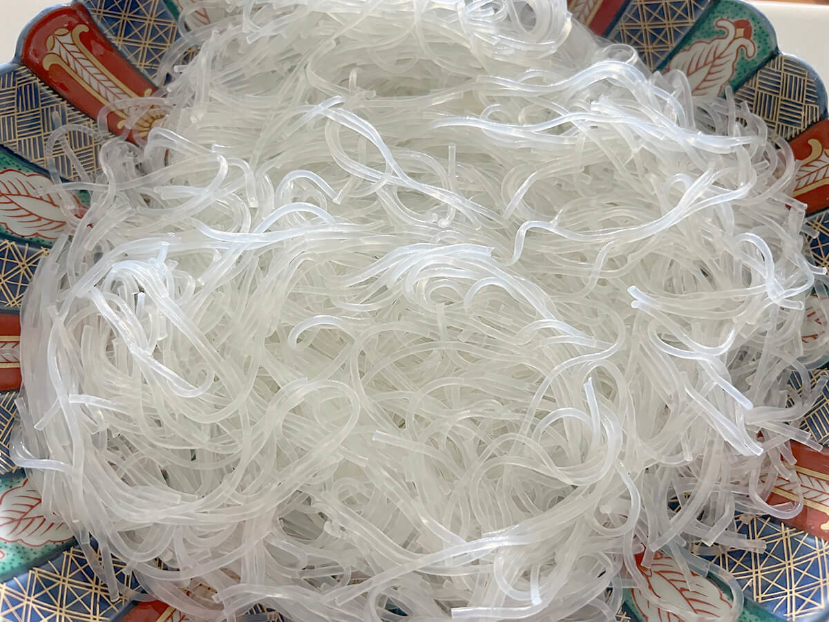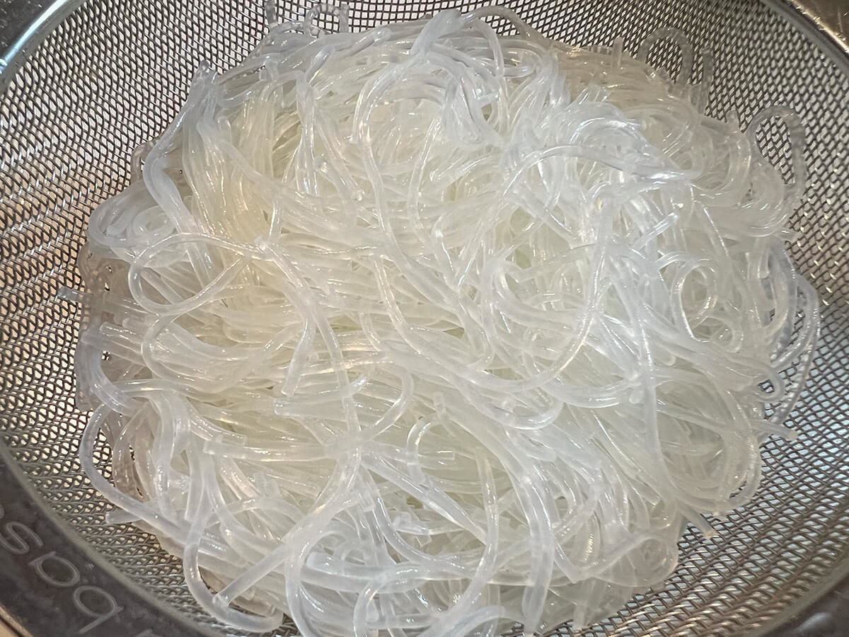 同じ湯に春雨を入れて5分ゆで、別のザルに上げて流水で洗い、冷ましてから水気を押し絞り、食べやすい長さに切っておきましょう。お湯を使い回すと楽なんだ!
