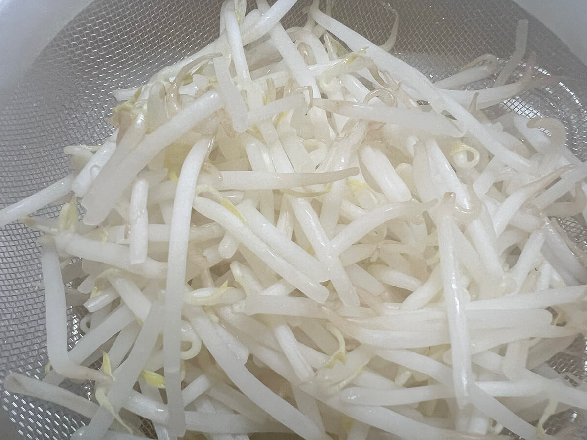 鍋にたっぷりの湯を沸かし、もやしを少し歯ごたえを残すようにゆで、網じゃくしでザルにとって粗熱をとります。