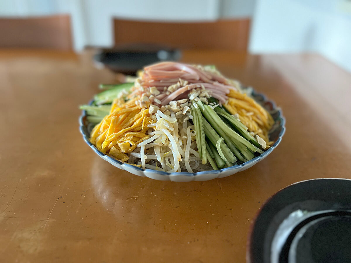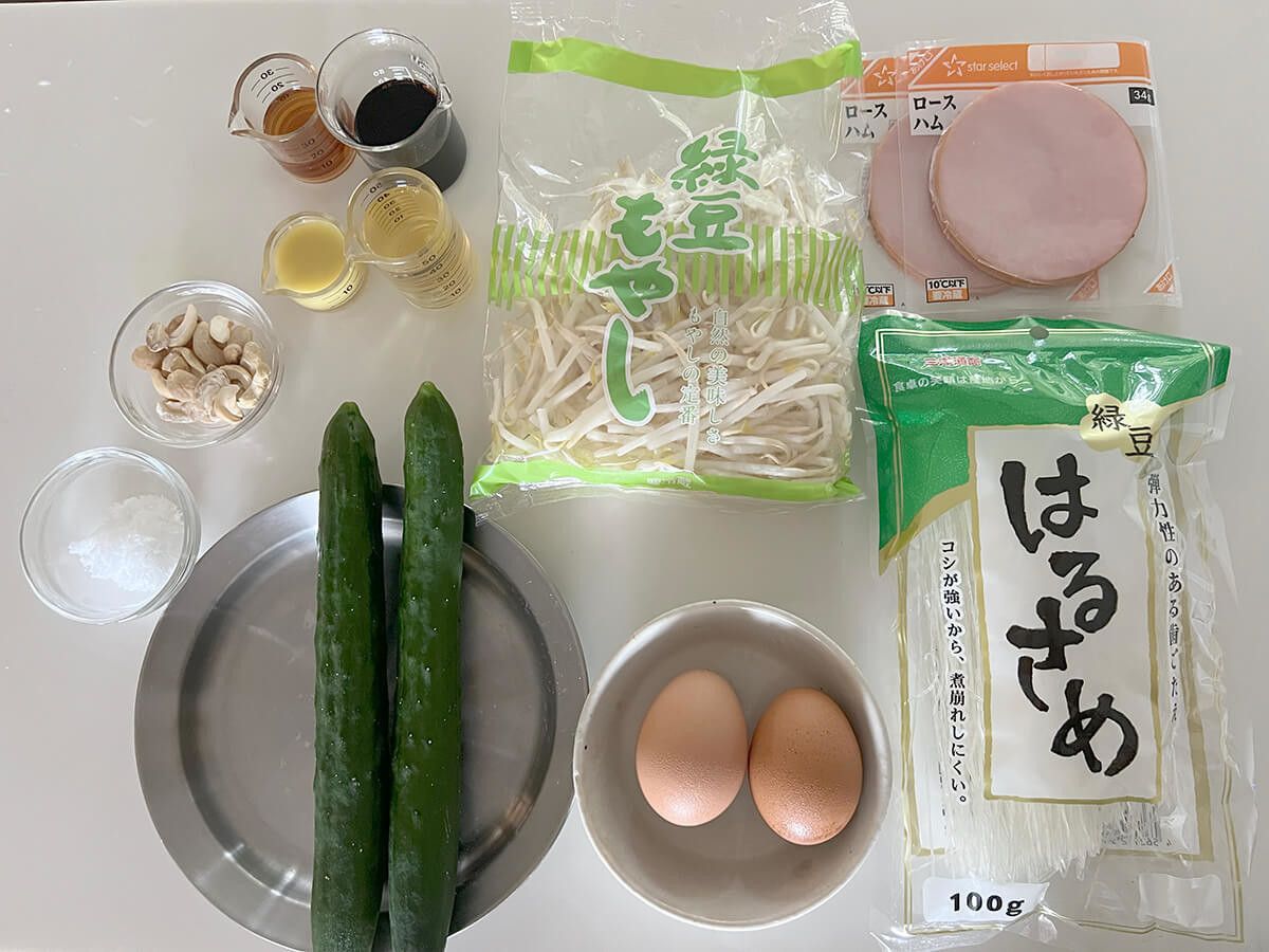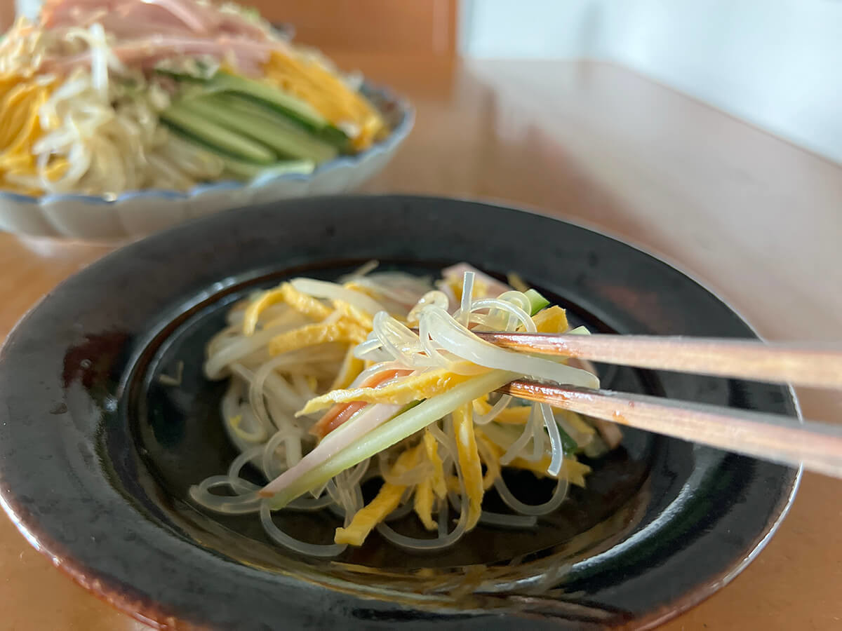 つるつるした春雨、パリっとした食感のきゅうり、やわらかな卵とうまみの強いハムの味が口の中で合わさって、いつもの春雨サラダの味です。