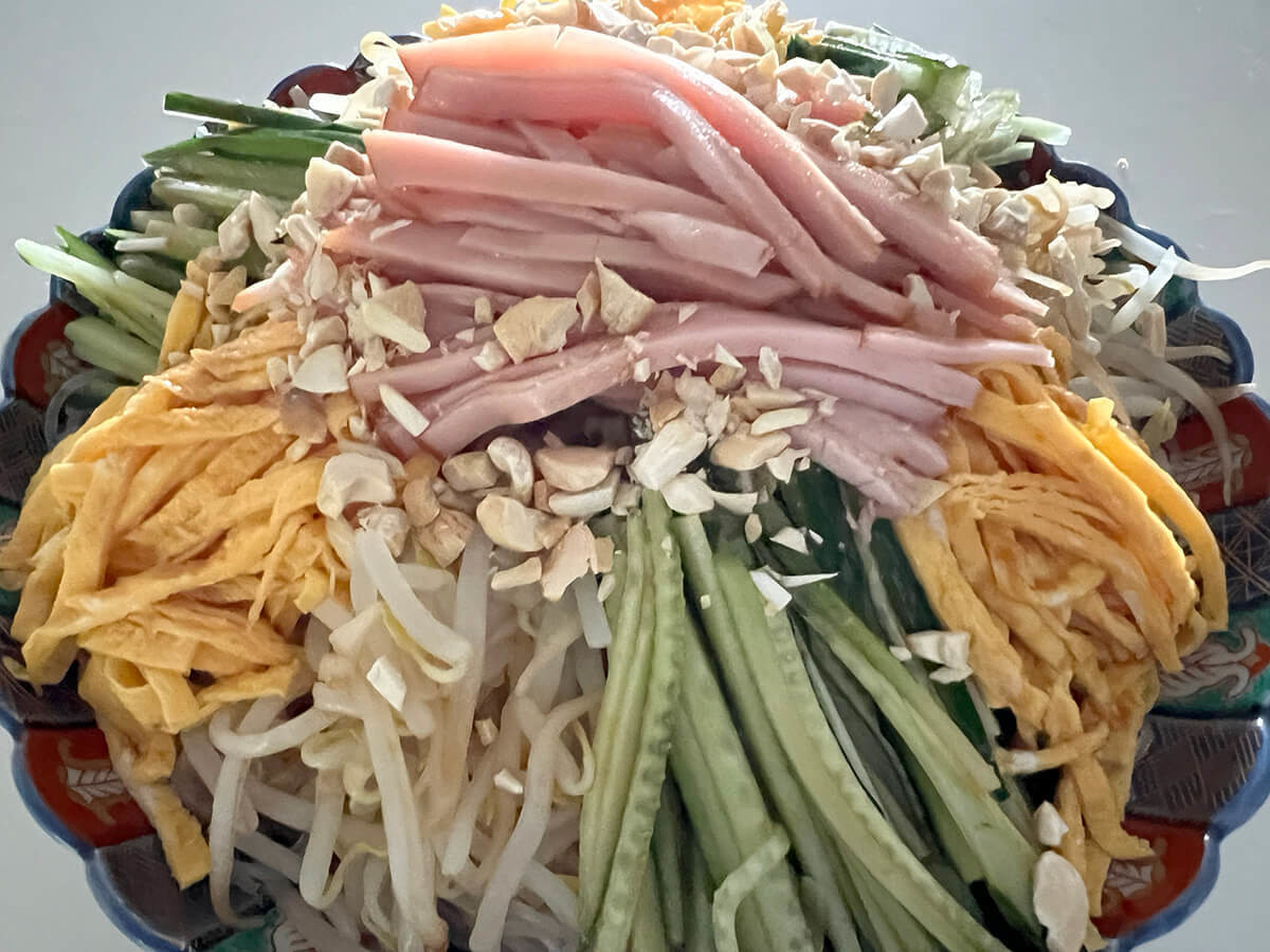 もやし、きゅうり、卵を3等分して放射状にのせ、中央にハムをのせて中華だれをかけ、刻んだバターピーナッツをふりかけたら完成です。