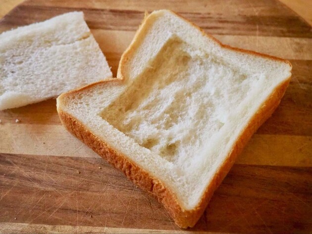 食パンの耳から1cmほど内側のところにナイフで1周切り込みを入れて、中央部分を剥がすとくぼみが完成します。