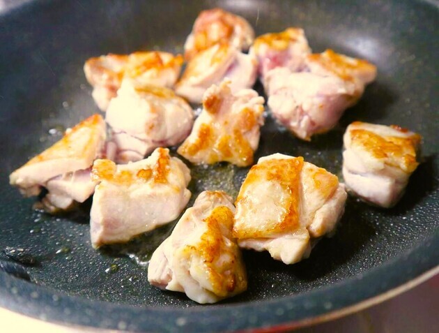 フライパンを中火にかけてごま油をひき、鶏もも肉を並べて両面こんがり焼く。