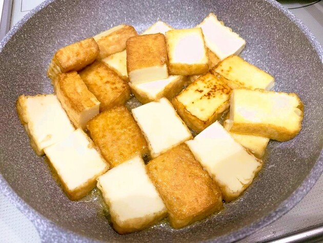 作り方②厚揚げを焦げ目がつく程度に焼く