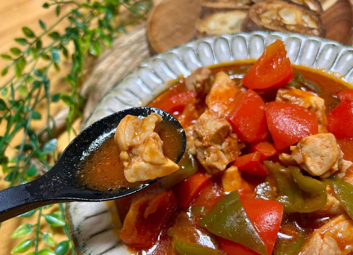 食べて本当に驚いたのが、煮汁の完成度の高さ!トマトジュースの酸味に鶏もも肉の旨みがしっかり出ており、想像以上に深みのある味わいに仕上がっています。