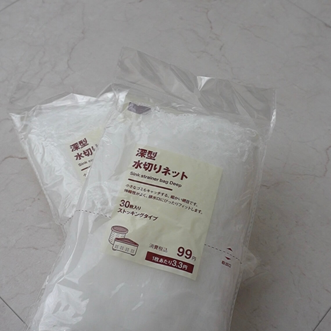 無印良品の水切りネットは、網目が細かく丈夫なところがお気に入り。それで水切れが良く、ネットが破れて生ゴミが散らばるストレスが少ないんです。