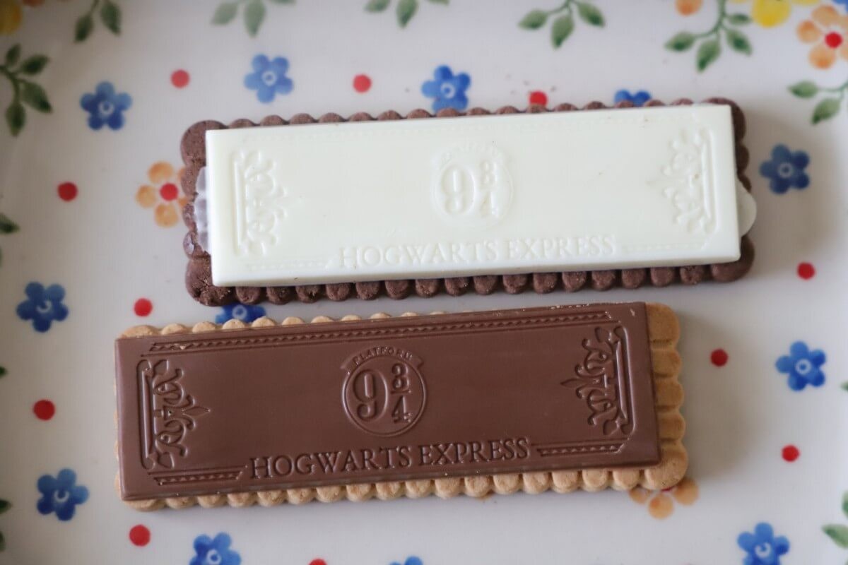 中身はプレーンクッキーにチョコがのっているタイプと、ココアクッキーにホワイトチョコがのっているタイプの2種類。それぞれに9¾とと刻印されています。