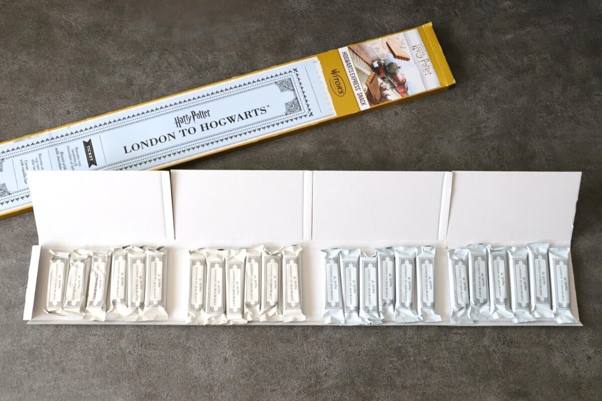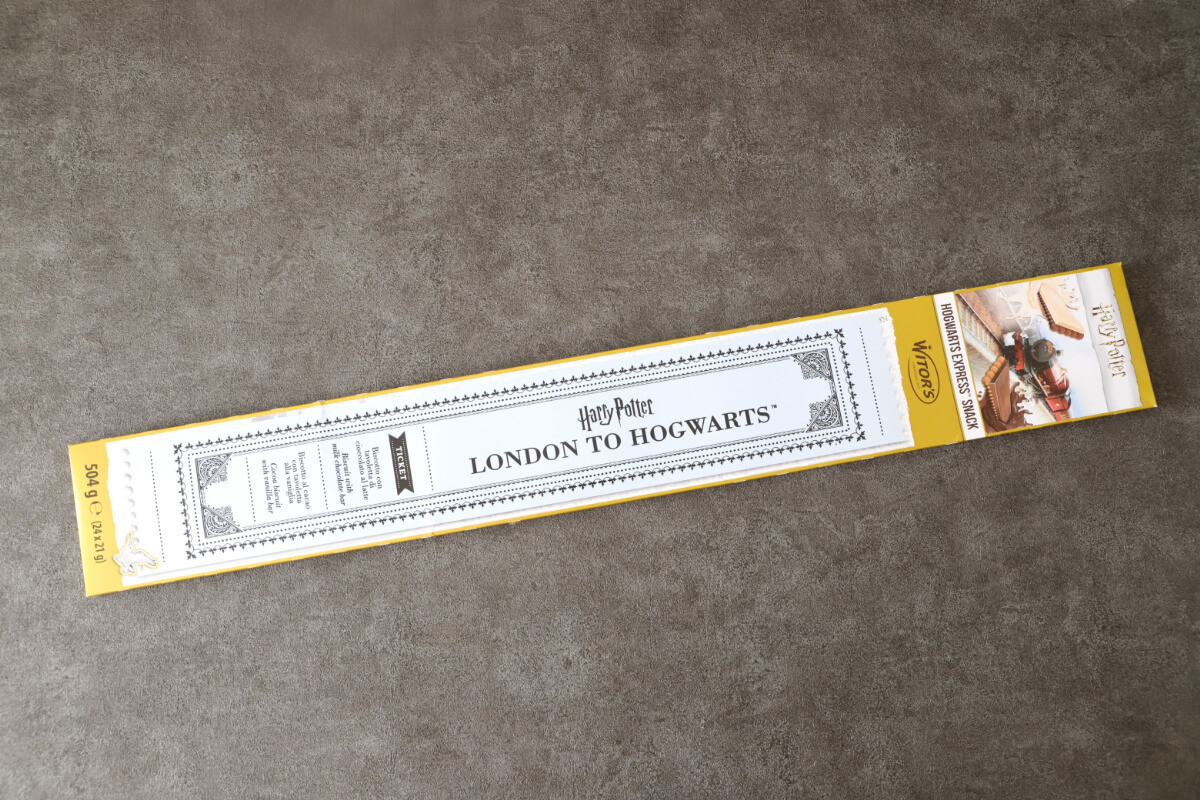 外箱は映画の中で重要なシーンとなる、「ホグワーツ行き」のチケットがイメージされたデザイン。