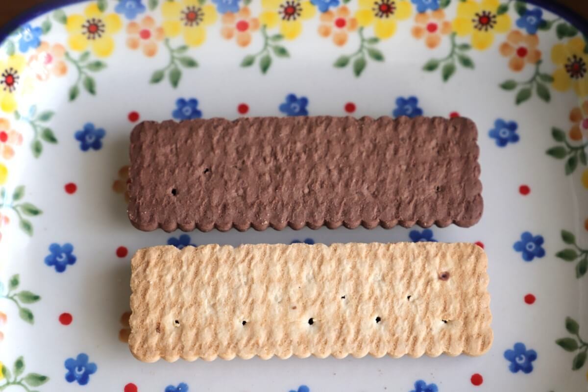 エネルギー(100gあたり): ミルクチョコ・ビスケット 493kcal / ミルキーバー・ココアビスケット 521kcal