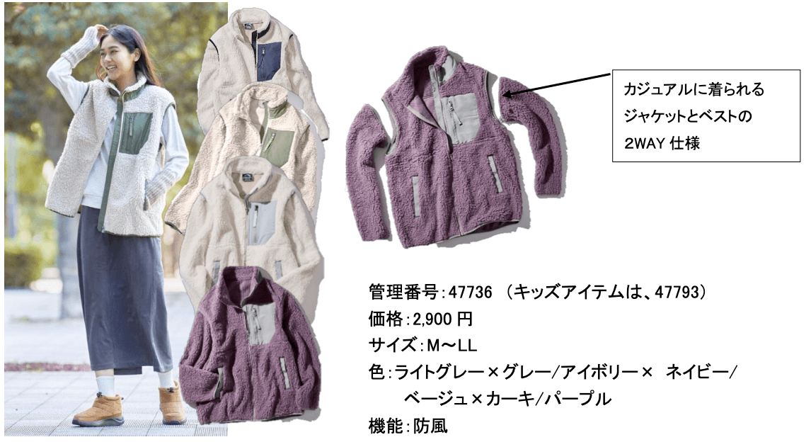 袖のファスナーでボアベストに早変わりする 2WAY の「トレルン」仕様 キッズも再登場