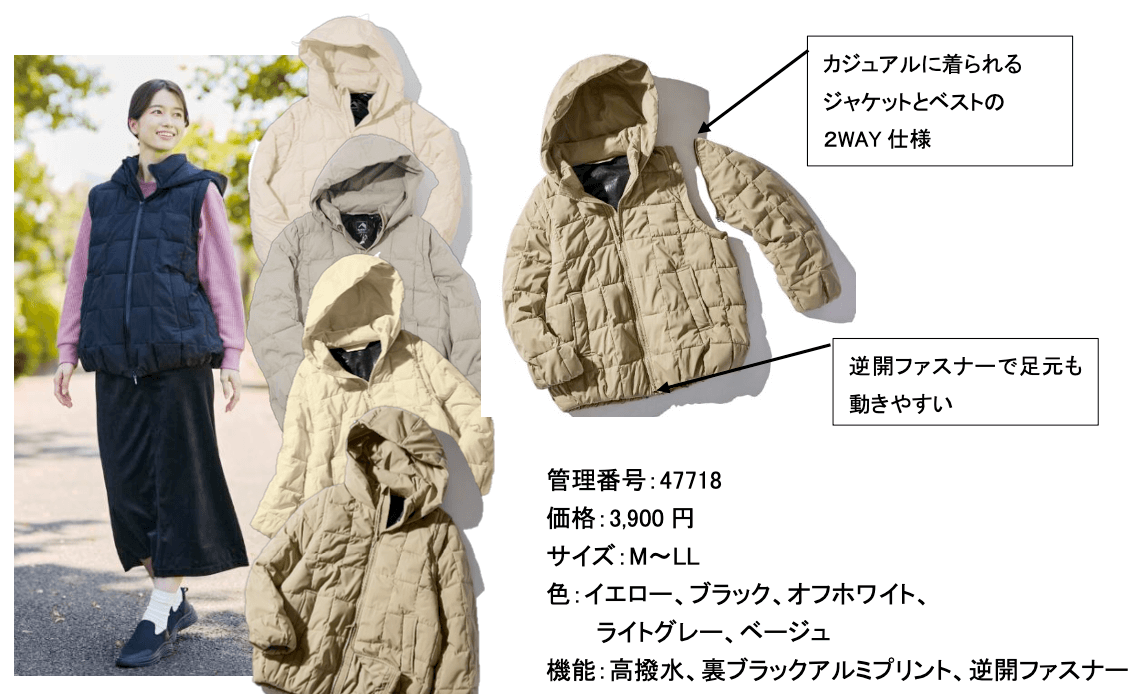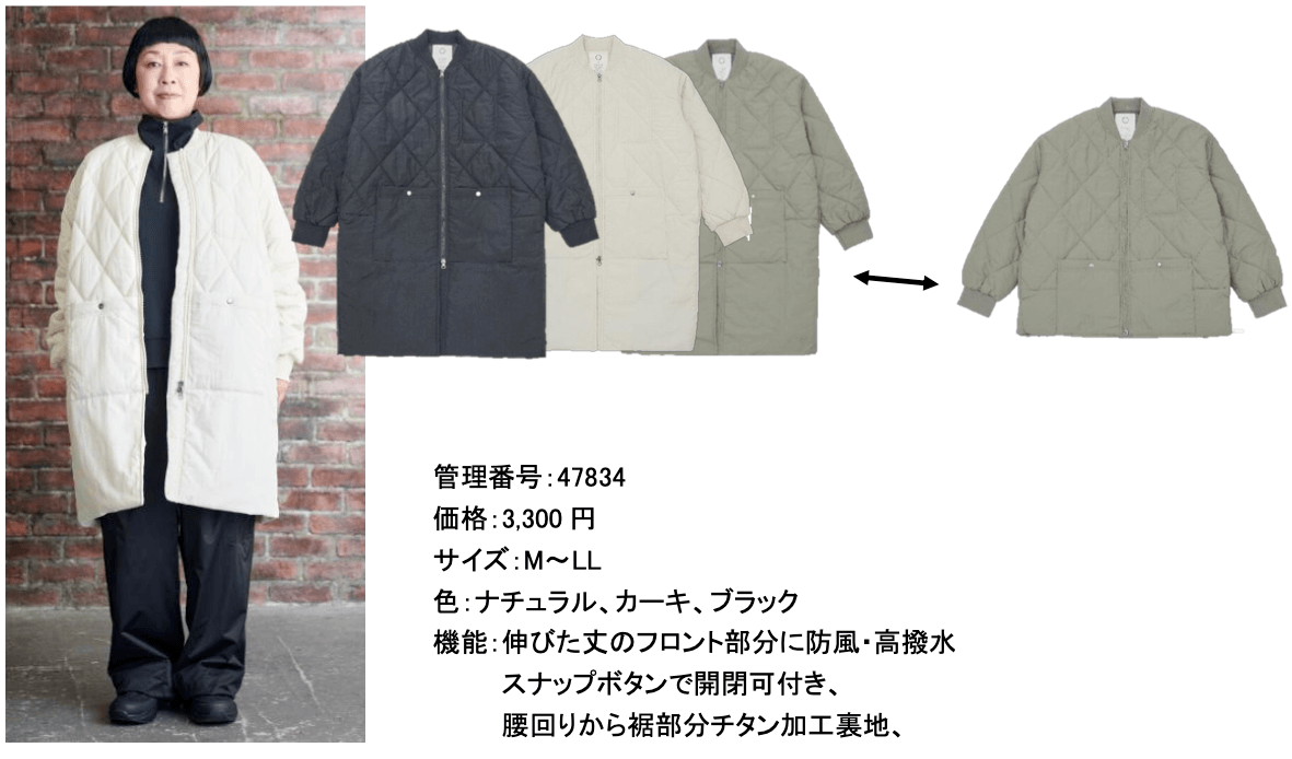 作業服を扱うWORKMAN Plusなどの既存店954店、作業服を扱わない新業態の WORKMAN Colors とその前身の#ワークマン女子店117店の、合計1071店を展開する株式会社ワークマンでは、近年深刻化する異常気象の影響、特に「夏が長く、秋が短い、すぐに冬が来る」という環境下で高まる「春先まで長く着用できるウェアがほしい」というお客様の声に応えるため、袖が取れたり、裾が伸びたりといった調整機能を搭載したアウターが発売されました。