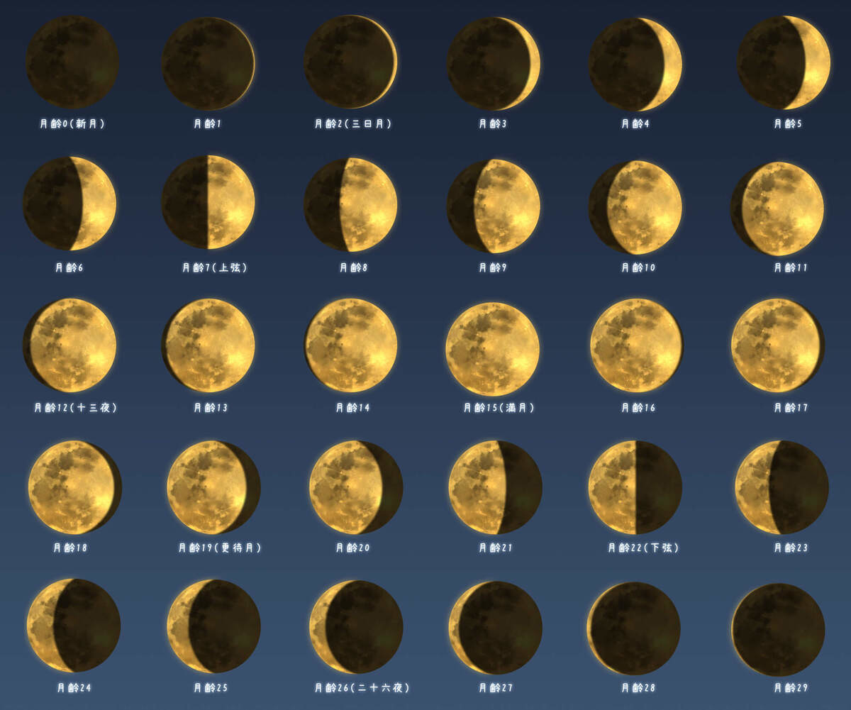 新月→ 三日月→ 上弦の月→ 満月→ 下弦の月→ 新月