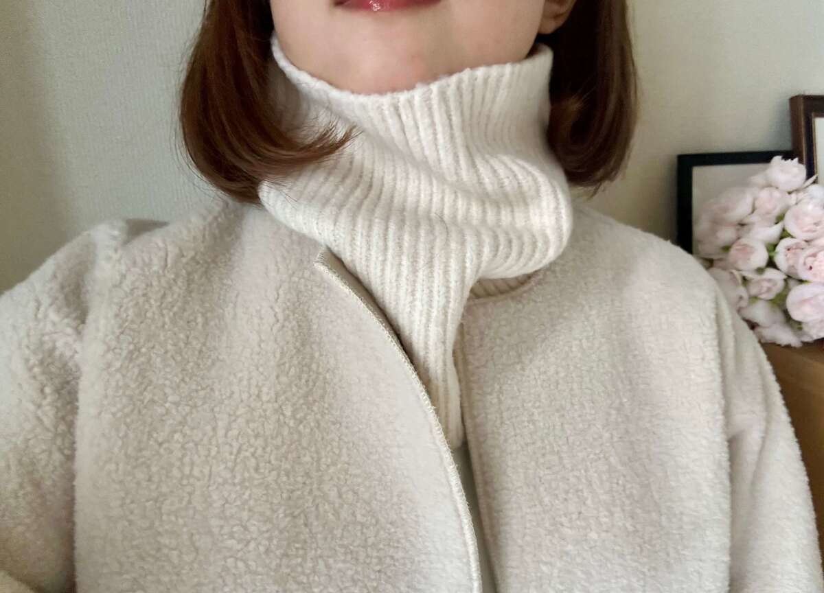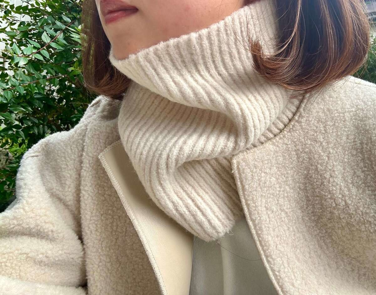 まるでおしゃれなセーターを着ているようにすら見えてしまう、「ネックウォーマー感がない」ところもいいですよね。この値段だと、すぐ売り切れてしまいそうな予感です。