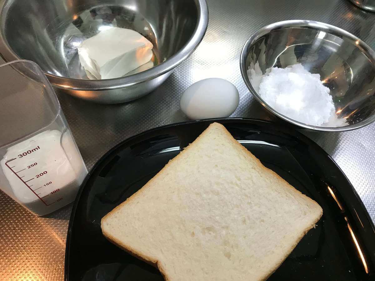 材料は、パン4枚切り1枚、クリームチーズ、砂糖、生クリーム、卵のみ!