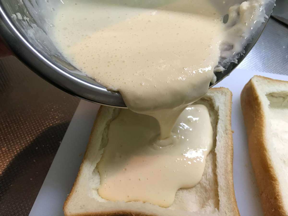 後はパンをスプーンなどで押し潰しながら枠を作って、流し込むだけ。トーストにパンを入れる時、クリームが零れないよう注意!