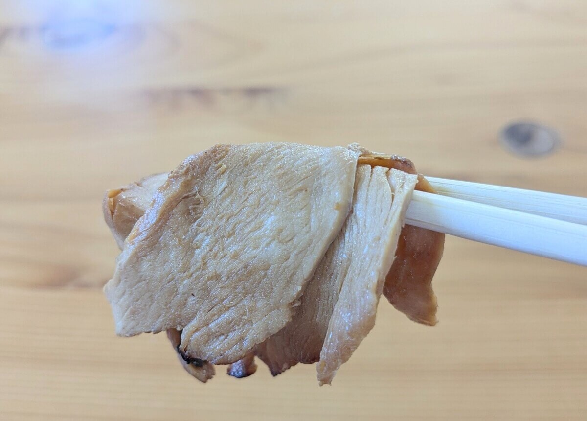 薄くスライスされた胸肉には、秘伝のタレがしっかり染み込んでいて、噛むたびにじゅわっと旨みが広がります。