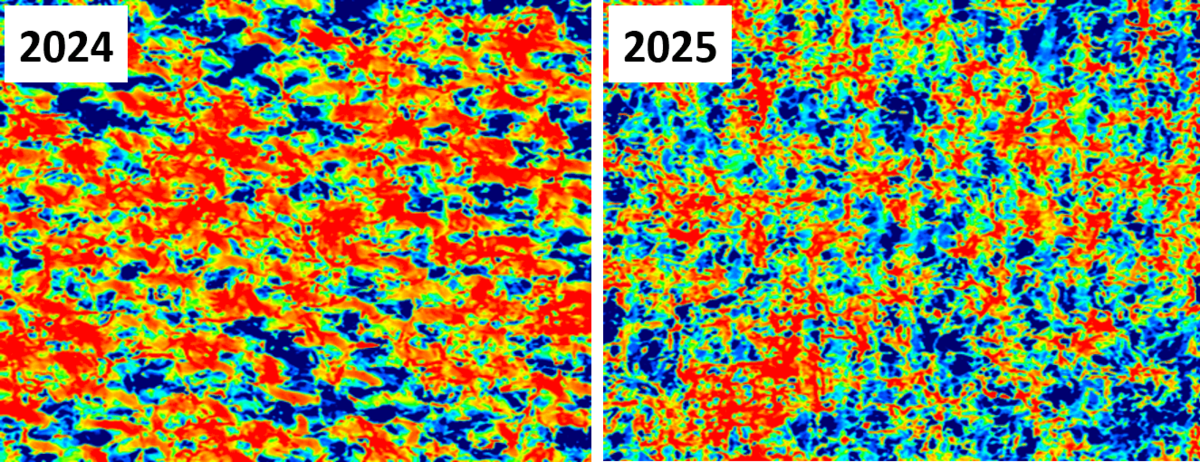 生地の凸部分が赤く、凹部分が青くなる3D形状データを確認すると2025年の生地の凹凸が小さくなめらかになっているのがわかります。