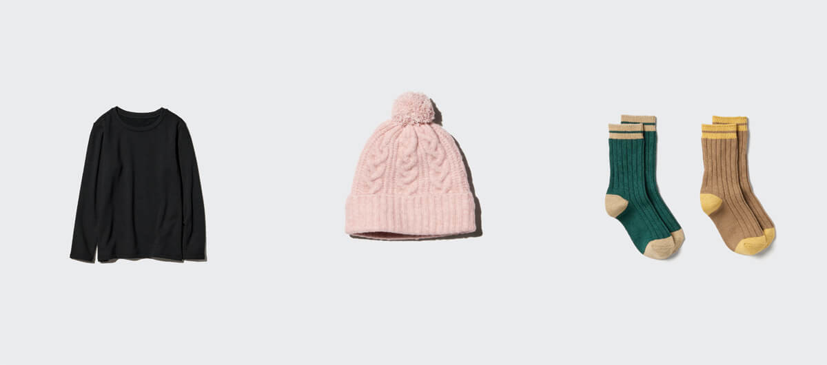 ▲超極暖ヒートテッククルーネックTシャツ(¥1,500)、ヒートテックスフレヤーンニットキャップ(¥1,290)、ヒートテックソックス2足組(¥790)