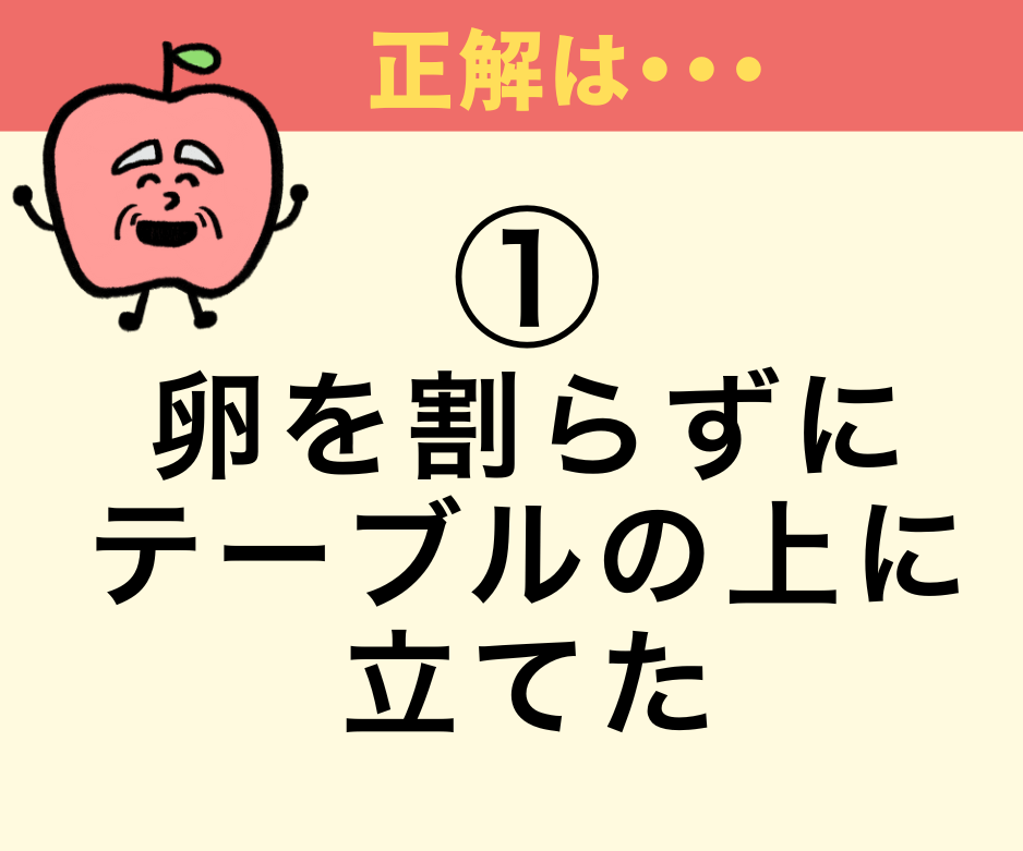 コロンブスは卵を受け取ると、卵の底を少しだけテーブルに打ちつけて、殻をわずかにへこませました。そのへこみに安定させて、卵を見事に立てて見せたのです。
