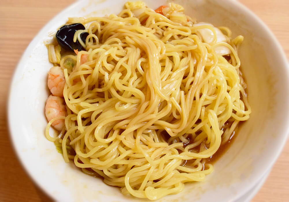 「海老五目そば」の麺は替え玉と同じく細麺です。とろみのあるスープとよく絡み合います。