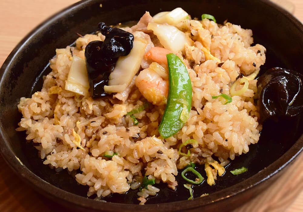 「鉄板玉子チャーハン」は、醤油やこしょう、ところどころお肉の味わいがしますので、熟成醤油ベースのスープとも馴染みやすいですね。「海老五目そば」の野菜を入れても違和感がなく、ボリュームアップしたチャーハンが楽しめます。