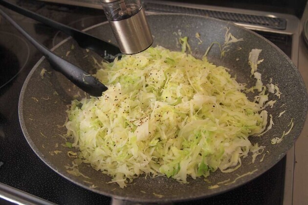 作り方①フライパンでキャベツを炒める