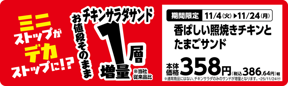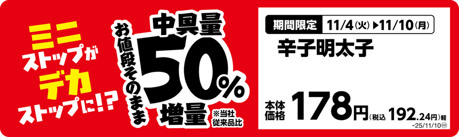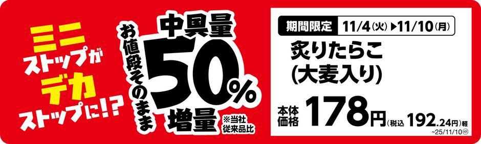コンビニエンスストアの「ミニストップ」は、「ミニストップがデカストップに!?」と題して、11月4日(火)から順次、お値段そのままで増量商品を発売します。