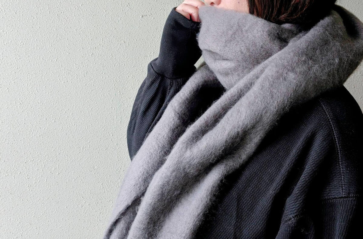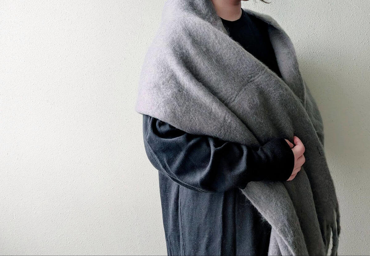 ストール代わりにしても、安心感のある大きさ。通勤時はマフラーとして、オフィスではひざ掛けにするのも良さげです。