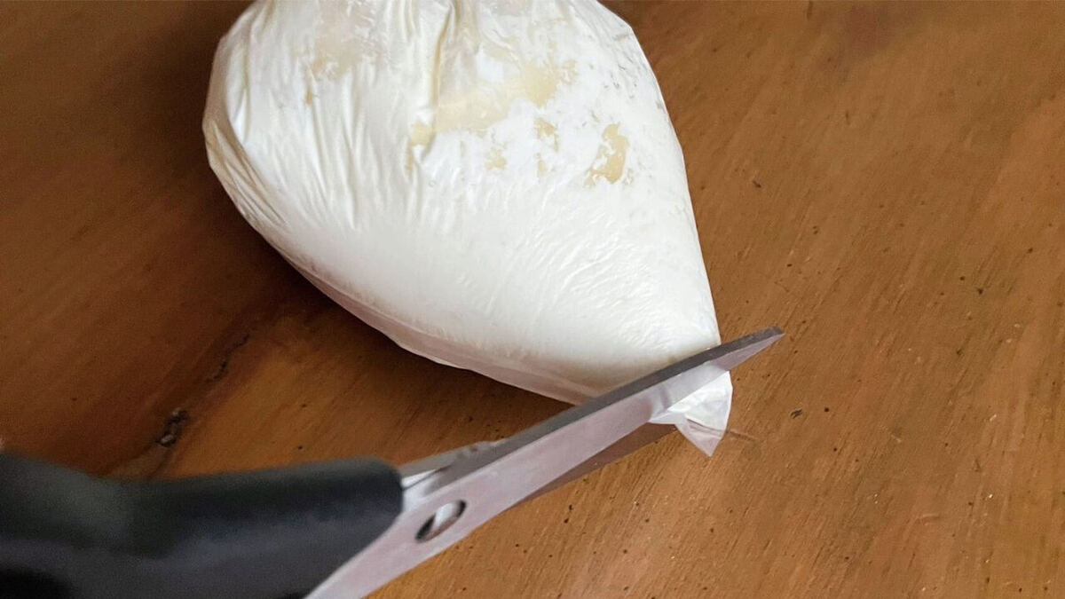 固まってきたことを確認したら、開口部の結び目をほどいてクリームを袋の角に寄せます。