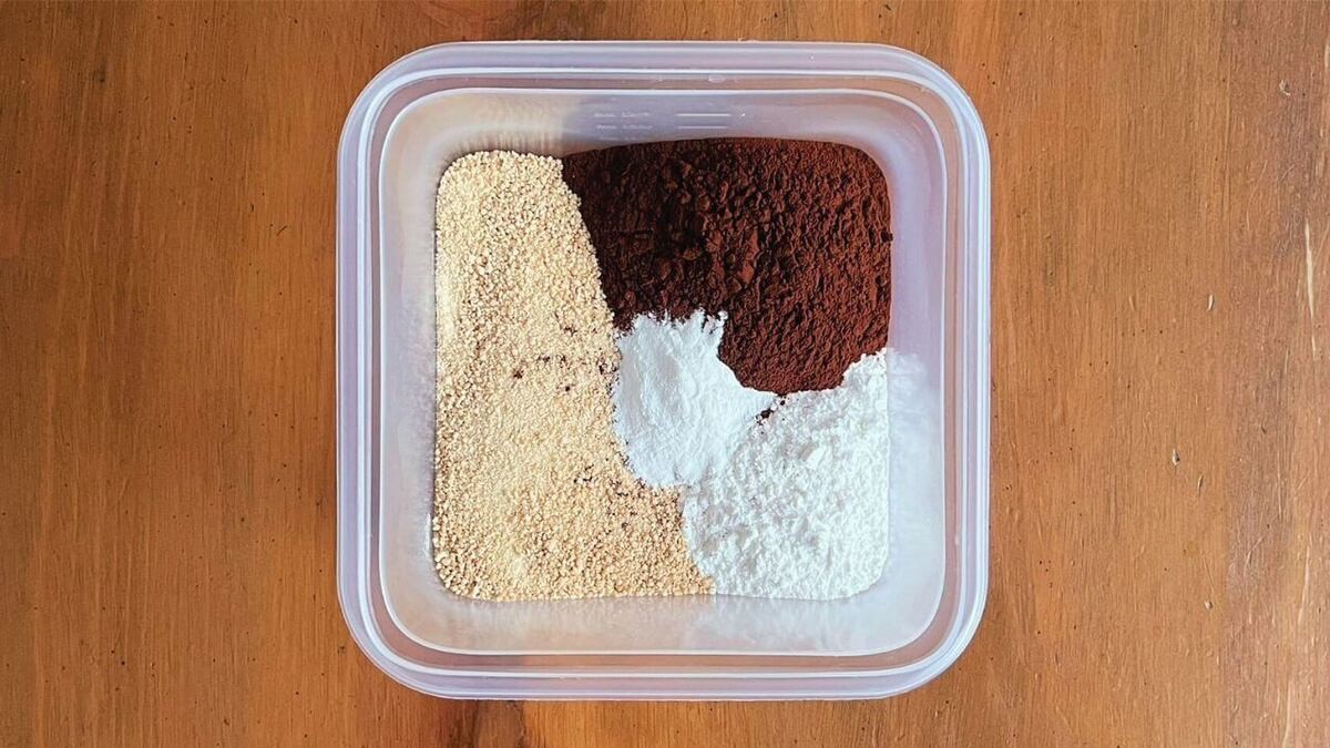 深さのある耐熱容器(1辺12~15cm)を用意し、薄力粉、ココアパウダー、砂糖、ベーキングパウダーを入れます。