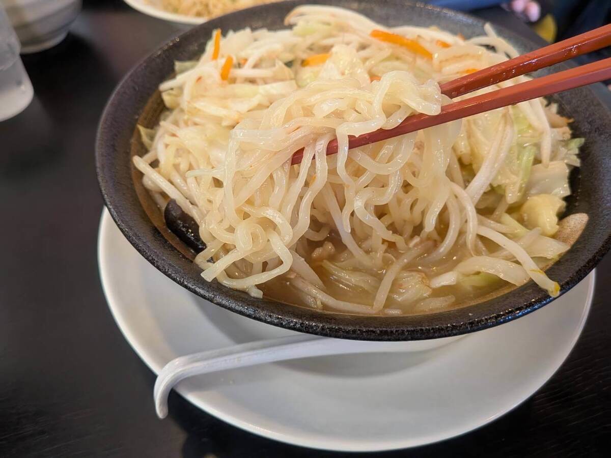 もやし、キャベツ、にんじん、きくらげ、ニラなど、炒めた野菜がどっさり。レンゲで何度すくっても、なかなか麺が見えてこないほど!