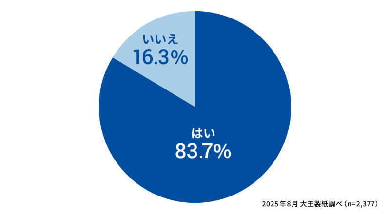 お掃除の方法や家の汚れで困っているかどうかを聞いたところ、「はい」が83.7%という回答でした。