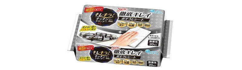 「キレキラ®!キッチンクリーナー 徹底キレイ おそうじシート」は、調理の前後に手軽に使えるキッチン用のウエットシートです。独自開発の立体凸凹シートに、界面活性剤入りの薬液と植物由来の洗浄成分を配合。