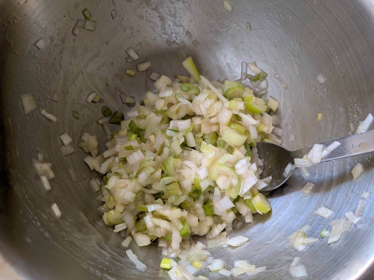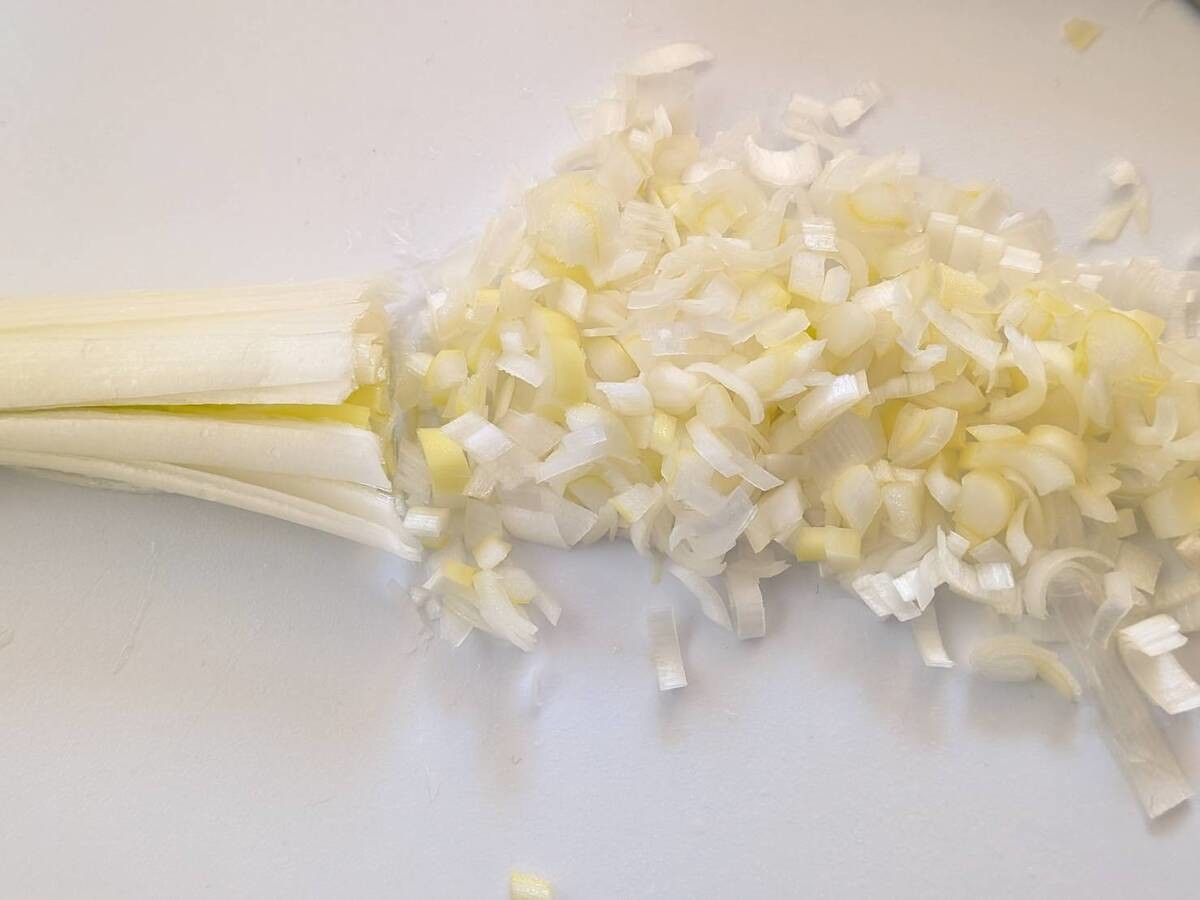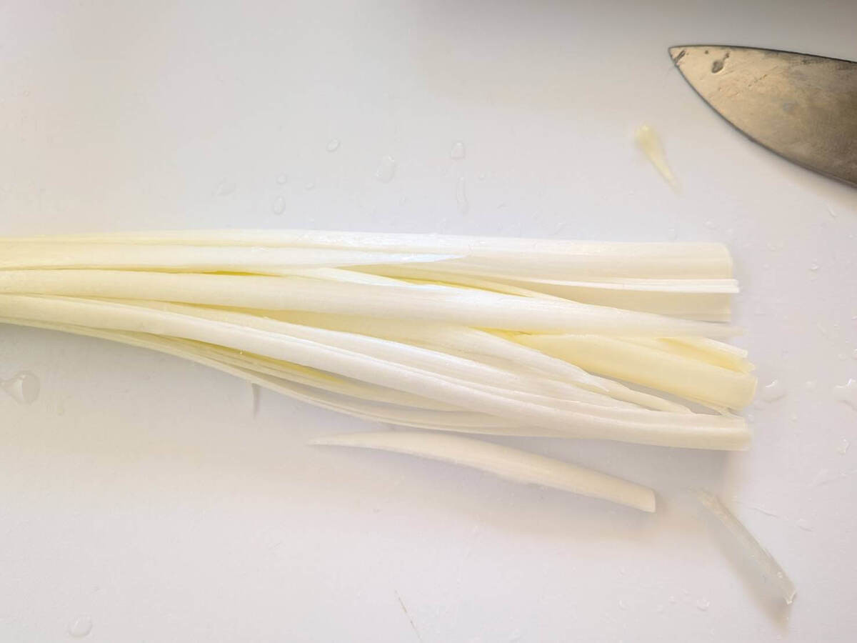 みじん切りは、長ねぎを横にして、たこさんウインナーのように切り目を入れて刻んでいくとうまくできますよ。