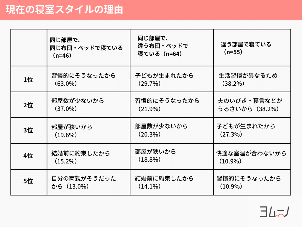 次いで、「部屋数が少ないから(37.0%)」「部屋が狭いから(19.6%)」という結果になりました。同棲時代などからの流れで、今も自然と一緒に寝ている夫婦もいました。