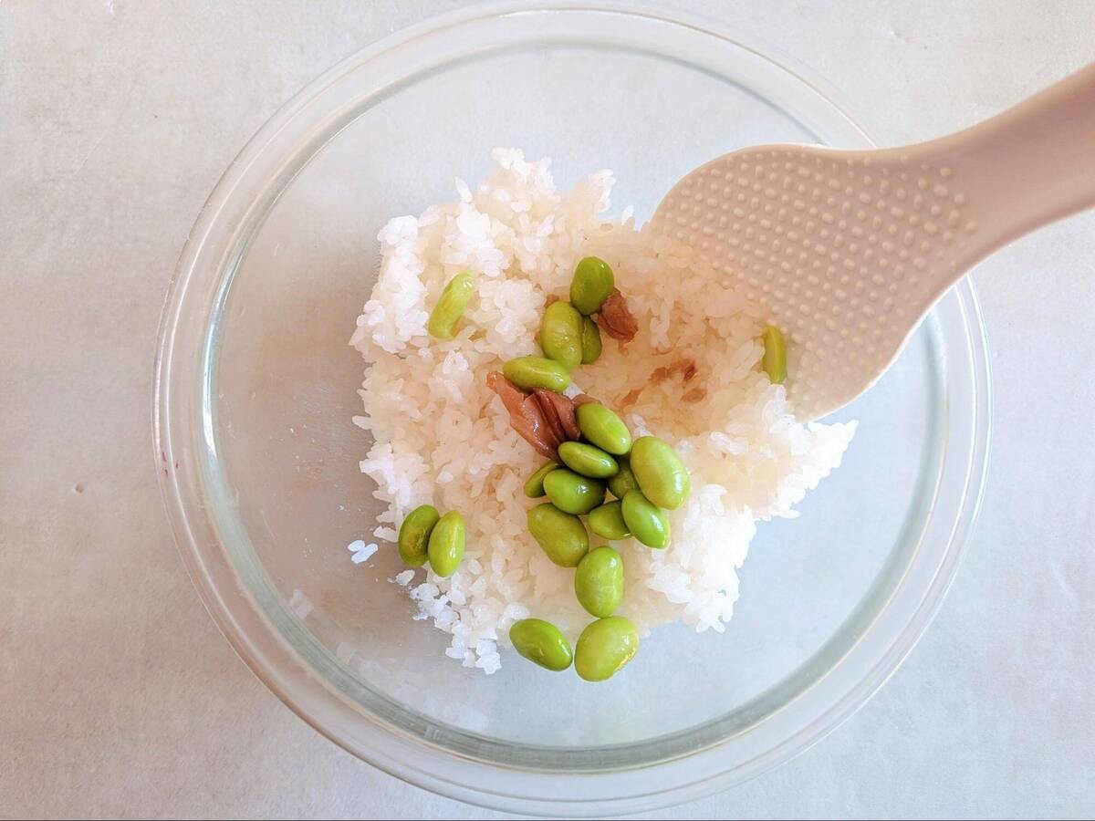 ご飯に枝豆、梅干しを入れて混ぜましょう。枝豆が崩れないよう、そっと混ぜた方が良さそうです。