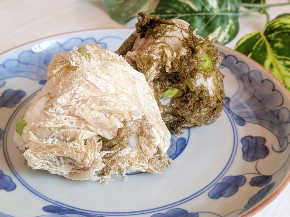 ①のおにぎりに、おぼろ昆布をまとわせる感じで軽く握ったら完成です。