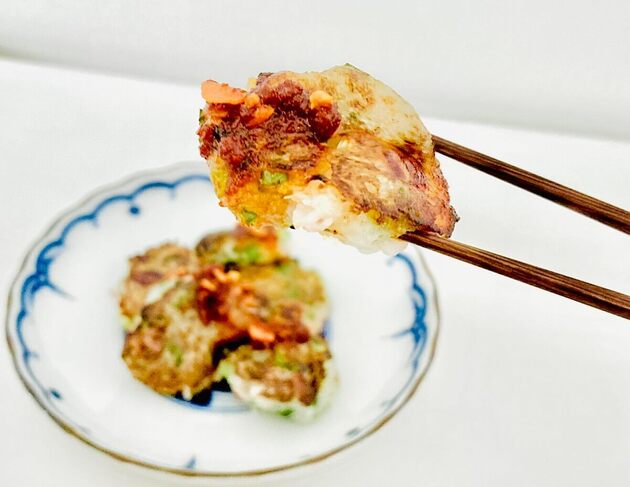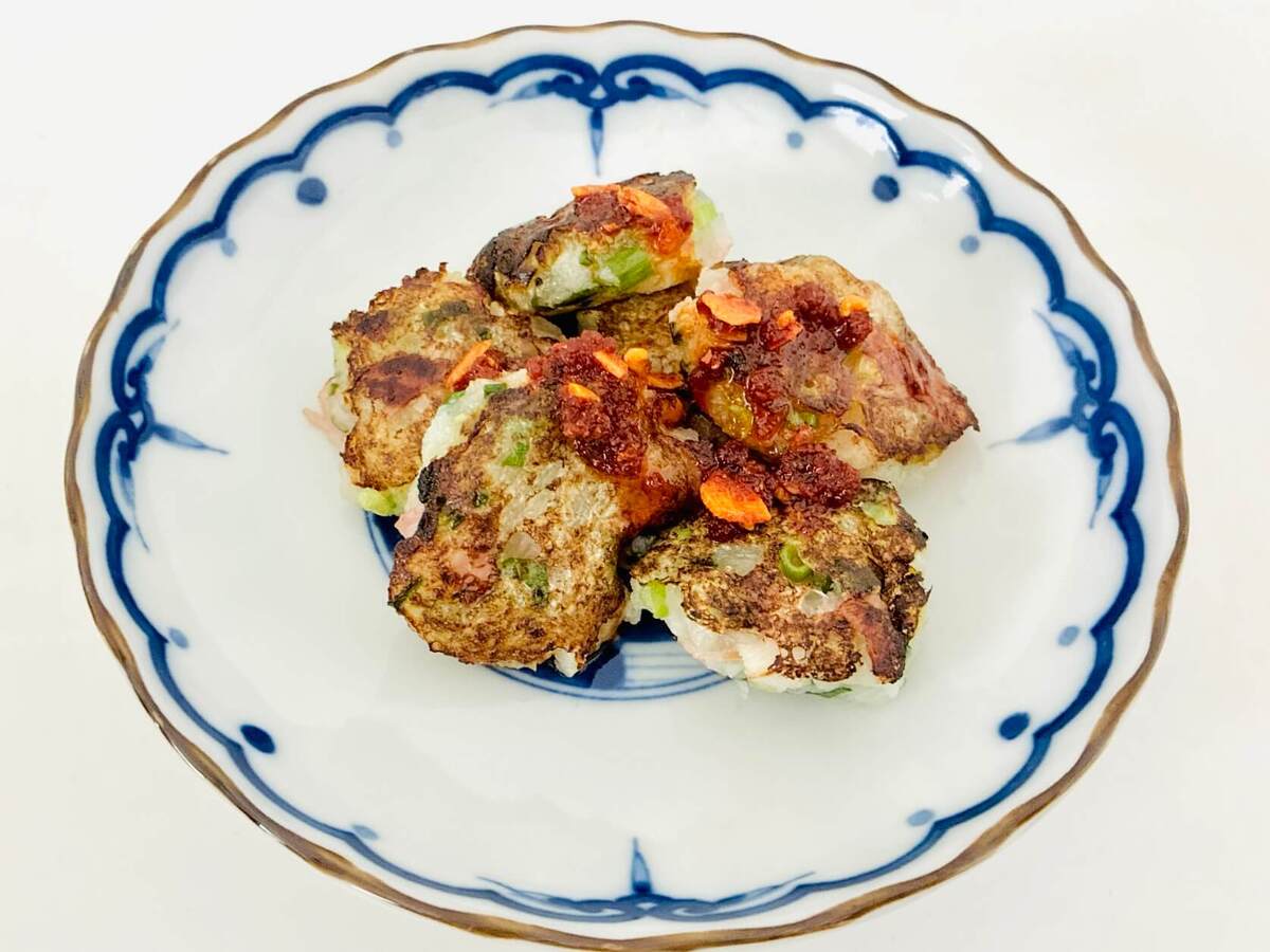 大根もち自体の味付けは塩ひとつまみでしたが、ベーコンとラー油のうま味や塩味、辛味、そして大根の甘味で完璧な仕上がりに。青ねぎは、彩りだけでなく薬味効果も発揮しています。