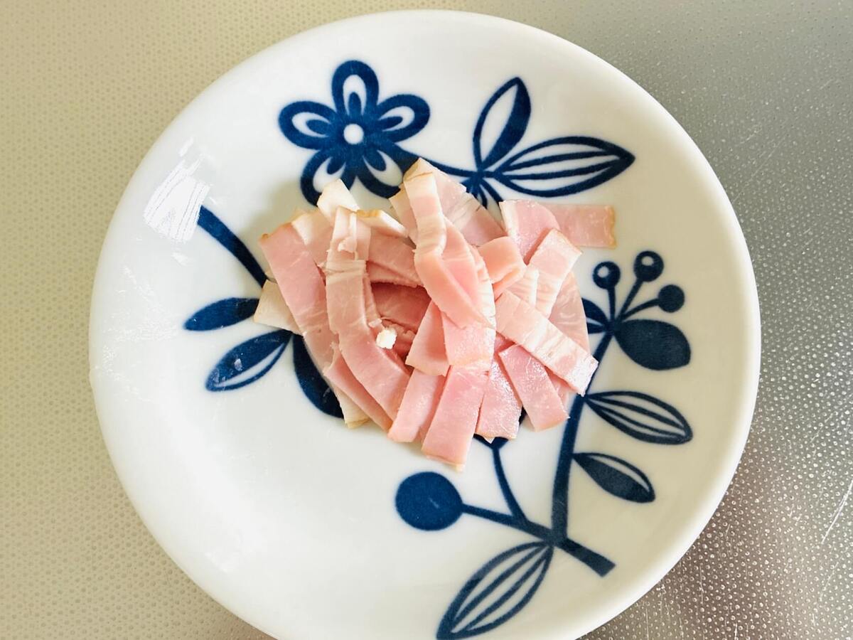 ベーコンは細切りにします。