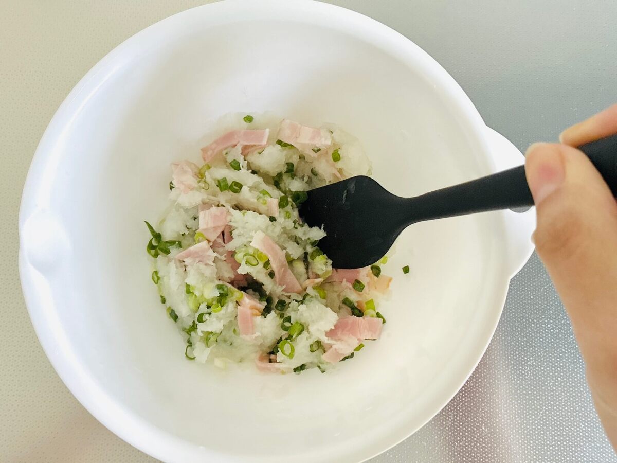 ボウルに大根おろしとベーコン、【A】を入れます。