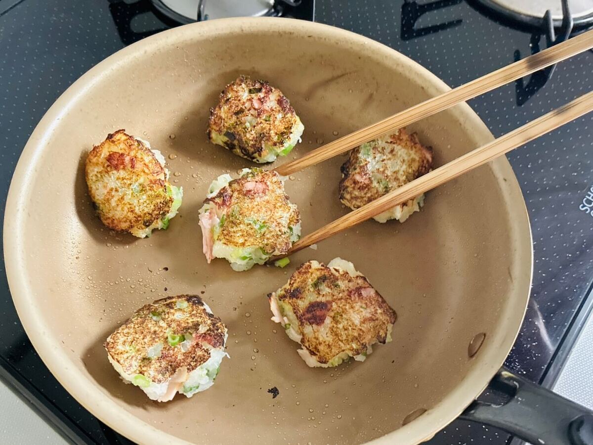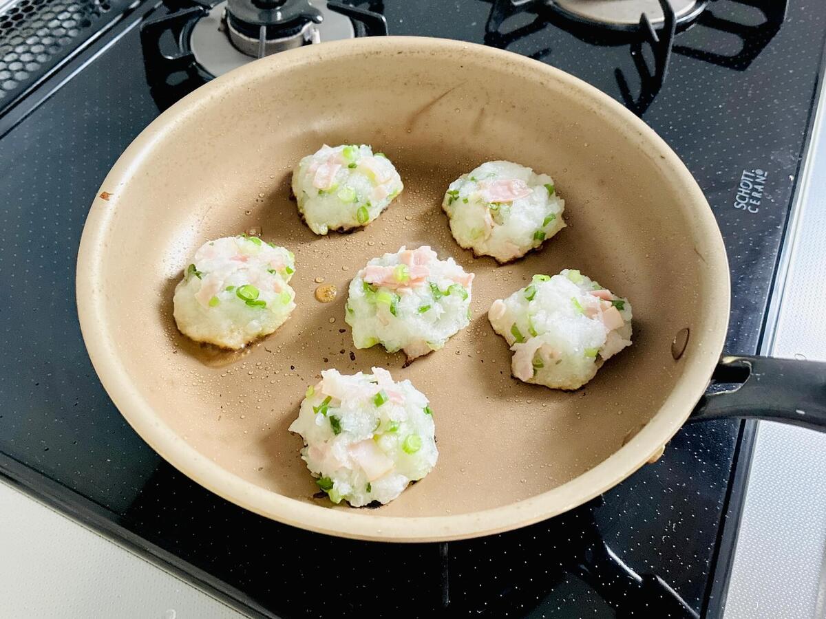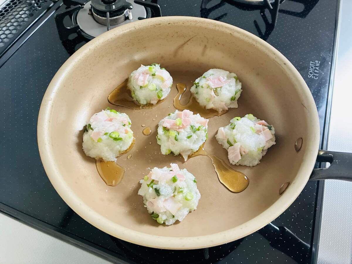 フライパンにごま油を入れて中火で熱し、③を大き目のひと口サイズに丸めて並べます。