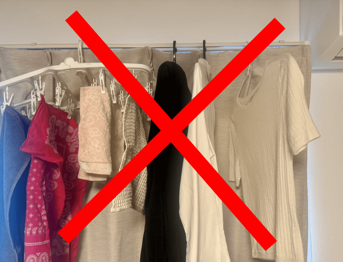 カーテンレールに洗濯物を干すのは、空気の流れが良くないため、おすすめではありません。さらに、カーテンの汚れがついたり、洗濯物の水分がカーテンに移ったりしてカビの原因にもなります。