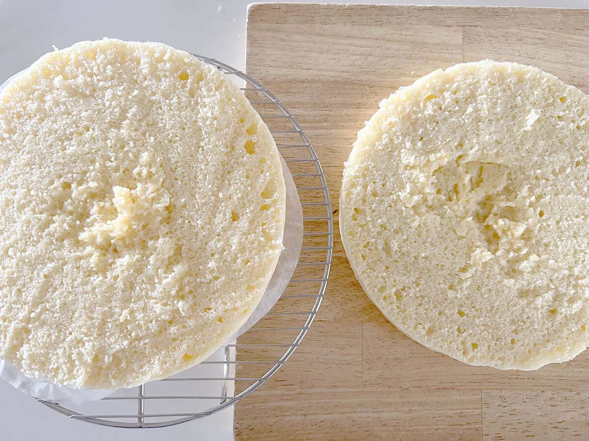 ケーキクーラーにのせて冷ましています。底の紙まで外すとボコボコになりそうなので、こんな感じで冷ましてみました。